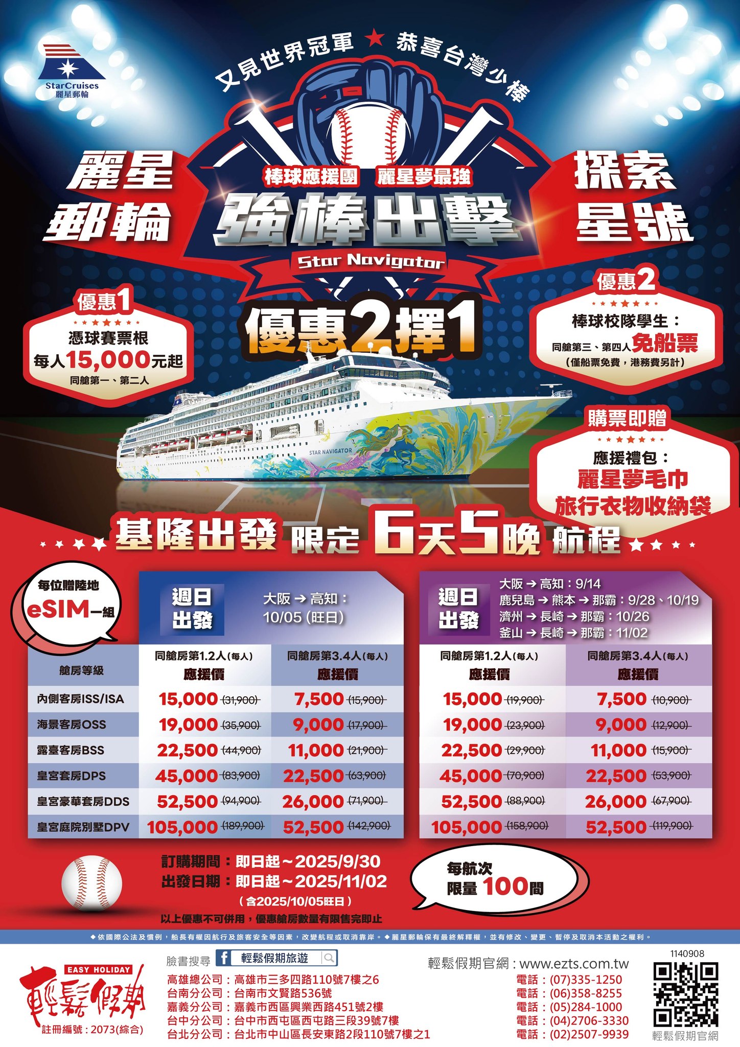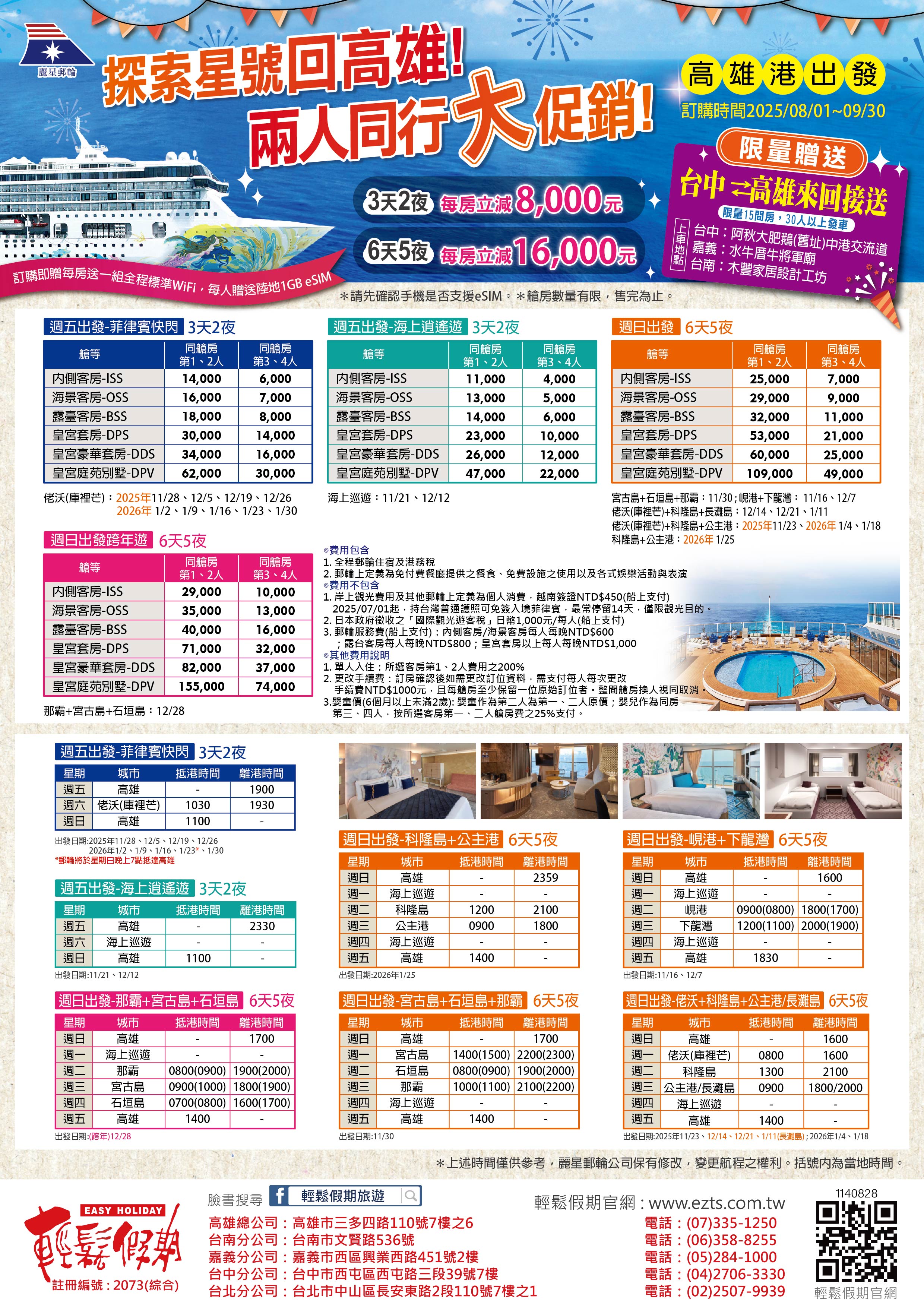 - ★獨家贈送★探索星號高雄出發,限量贈送台中/高雄來回接送(限量15間房,30人以上發車),詳細請洽捷利旅行社(07)335-1250